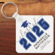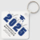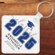 Celebrate this special milestone with a stylish and personalized keychain designed for the graduate. Featuring "Class of 2025" (or any year) in bold typography, the year and graduation cap icon are highlighted in blue for a striking contrast, while all other text remains classic black. At the bottom, there’s a customizable space for the graduate’s school name, making it a unique and meaningful keepsake. A simple black frame borders the edges for a polished and timeless look.