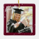 This commemorative keepsake ceramic ornament style shown features two photos of the graduate...one on the front with their name, school and graduation year in a brush script font with an EDITABLE BURGUNDY/MAROON border and muted stars on the front and one full-bleed photo on the back with the title CLASS OF "YEAR." The font style/colour/size/placement can be changed on the front and the back. Delete any sample text not desired. Note that other ornament styles may not offer back side printing.