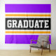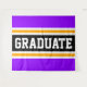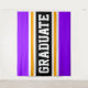 This sporty, athletic design features bold GRADUATE text inside a highlighted wide black stripe with double white and yellow orange racing stripes against bright purple outer stripes. The text in this design can be personalized.