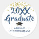 Graduate Gold Glitter Confetti Brush Script Blue Classic Round Sticker