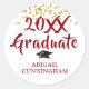 Modern handwritten brush script 20XX GRADUATE graduation party favour stickers or envelope seals with gold glitter confetti and red mortarboard personalized with your graduate's name and graduating year. Contact the designer via Zazzle Chat or makeitaboutyoustore@gmail.com if you'd like this design modified, on another product or would like coordinating items.