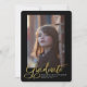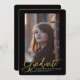 Elegant and modern graduation announcement card template for high school or college graduates! You can add your photo in the middle. There is a text overlay in faux gold script font that says "Graduate" against a black background. Customize this product by adding the graduate's name, school, graduation date.