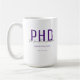 Une grande tasse de doctorat qui indique le nom du diplômé, le domaine d’études et la date de fin d’études. La tasse inclut le nom dans une police de script manuscrite et une conception violette et noire. C’est un grand plaisir pour un gardien ou une fête. Ajoutez simplement les infos du diplômé, ajoutez cette tasse à votre panier, et félicitations pour cette étape majeure ! Graduate Keepsaké Purple Nom PhD Grand café Mug Conception de jour férié | ©Melissa Patton - Designer