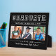 Classic 3 photo graduation plaque display sign with easel features Graduate in bold serif lettering with modern custom text that can be fully customized with the graduate's full name, class year, and school name. Add three favourite pictures of the graduate to the square placeholder images. Black background colour can be modified.