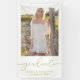 This design features a graduate, picture, photo banner, perfect for high school, or college, with gold, calligraphy script, and simple typography, a simple, minimalist style