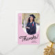 A graduate thank you card featuring a vertical photo with an arched edge. Personalize this light pink and black card with your own message of gratitude or use the one shown.