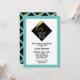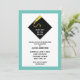 Creative graduation invites featuring classic black cap and gold tassel design pattern on teal blue background.