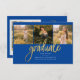 Graduation 4 Photo Collage Script Blue Gold carte Faire-part. Customisez facilement en changeant le texte et en remplaçant les photos par les vôtres. Une façon moderne et moderne d'annoncer votre diplôme cette année!