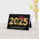 Gold foil balloons for 2025 graduation on a black background with a red cap and gold confetti.
