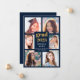 Send your family and friends a modern personalized photo collage graduation card to wow them. This modern template design features six photos for you to change to your own framed in blue. In the centre in gold and white typography is the word "Grad" with the year, your name and school to personalize. The back of the card is blue. Designed by Susan Coffey.