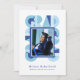 Retro-style, yet modern, graduation announcement photo card that features the word "GRAD" designed with geometric shapes in various colors that form a border around the photo of the graduate. Retro colors—blue, teal, white—add to the card's retro style.
