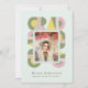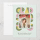 Retro-style, yet modern, graduation announcement photo card that features the word "GRAD" designed with geometric shapes in various colors that form a border around the photo of the graduate. Retro colors—green, dusty pink, mint—add to the card's retro style.