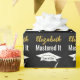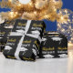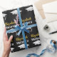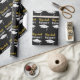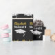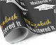 The graduate's name and Mastered It accompany a white grad's cap with class of 20xx in a pattern. You can edit the text to show the grad's name and year the student is receiving the master's degree. The wrapping paper is black, white, and gold. The name of the grad will be in a faux (not foil) gold cursive script.