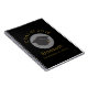 A spiral notebook which says Class of 20xx and the graduate's name and school, written in a gold colour. Designed with a black graduation cap surrounded by a semi-transparent white circle. Black background with gold lettering is simple yet stylish.