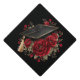 This graduation cap topper is shown in Black with a full bloomed Red Roses and cap print.