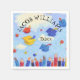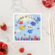 For a graduation party, these napkins are decorated with a scene of tossing colourful graduation caps into the air, shown against a blue sky with puffy clouds along with a name and year for you to personalize.