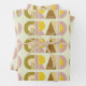 Retro-style graduation gift wrapping paper sheets that features the word "GRAD" designed with geometric shapes in various colors. Retro colors—yellow, pink, brown, and green—add to the retro style.