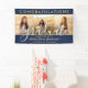 Add an elegant personalized touch to college or high school graduation party decorations with a custom 3 photo collage banner. The pictures and all wording on this template are simple to personalize, and colours are easy to change with the Zazzle design tool. The navy blue and gold design features a faux foil mortar board cap, trendy handwritten script calligraphy, chic modern minimalist typography, and three photos of your choice, such as senior pictures or images from the commencement ceremony. Please note that gold is printed colour, not metallic foil. This large graduation party sign can be hung on a wall to welcome guests to the celebration or used as a fun and stylish photo booth backdrop. Congratulations to the graduate!