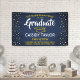 Add a personalized touch to college or high school graduation party decorations with this custom navy blue and gold yellow banner. All text is simple to customize to include name, class year, school, degree, honours, inspirational quote, or other text of your choice. Design features a mortar board cap, festive confetti dots, stylish modern typography, and handwritten style script calligraphy. Please note that gold is printed colour, not metallic foil. This party sign is an elegant way to celebrate the special day. Congratulations to the graduate!
