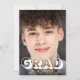 Celebrate your graduate's achievements with family and friends from a safe distance with a drive through graduation party. The front of this modern invite is filled with his or her favourite photo and "GRAD" written in cool large white typography that is partly transparent, and his or her name, school and class year underneath. On the reverse of the invitation you can easily personalize the drive by party details, such as where and when to drive by, gift drop off and treats areas, safety precautions, whether he or she will host a live facebook, instagram or other online event later and where to get more information.