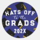 Creative graduation envelope seals, party favour labels or grad gift stickers featuring black and gold graduation caps on blue background.