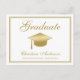 Send your family and friends this elegant graduation party invitation postcard. This design features a gold graduation cap written in a modern faux gold script typography which reads"Graduate". Below the cap is your name, school and year details on a white background. The back of the postcard has your invitation details in faux gold on white. Designed just for you by artist ©Susan Coffey.