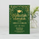 Graduation party invitation for men or women. Elegant invite card in green and gold. Modern simple design featuring faux glitter confetti, a cap and typography script font. Perfect for a stylish graduation celebration.