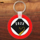Unique little graduation memento keepsake keychain gift featuring black cap with gold tassel design on a red background. To customize edit text to change senior class year.