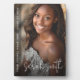 Graduation photo plaque with with your name in a modern script font and the school name and year aligned to the left over a dark, vertical overlay.