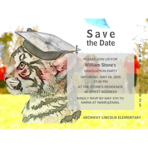 Create custom graduation name cards with three of your favourite photos. Tiger Grad Design on the front. Graduate details are on the back along with space for three photos. Use the template to personalize. Graduation Name Card with photos.