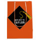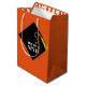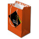 Creative graduation gift bag featuring black and gold cap on orange background. Edit text to add senior grad's name.