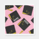 Creative grad party napkins featuring black and gold graduation caps on pink background. To personalize edit text to add his or her name and senior class year.