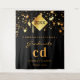 A chic black background. Decorated with golden stars and a modern, abstract faux gold cap, hat, tassel topper with the year inside. Text: Congratulations! and Graduate. Personalize and add a year, monogram initials, name and school name. For both him and her. A banner , party decoration, or photo booth, backdrop for a 20xx (or any year) graduation party.
