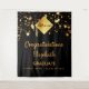 A chic black background. Decorated with dripping golden stars and a modern, abstract faux gold cap, hat, tassel topper with the year inside. Personalize and add a name, school name/year. The text: Congratulations and the name are written with a large modern hand lettered style script. For both him and her. A banner , party decoration, or photo booth, backdrop, Year (any year) graduation party.