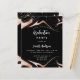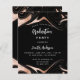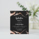 A modern style invitation for a graduation party. A black background decorated with rose gold swirls. Personalize and add a name and party details. The text Graduation and the name are written with modern hand lettered style script. White coloured text.