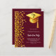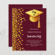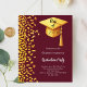 A modern, elegant Graduation party invitation. A burgundy background decorated with faux gold confetti and a large golden graduation cap with tassel. Personalize and add a name and party details. White text.