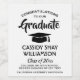 Add a personalized touch to college or high school graduation party decorations with these elegant black and white wine bottle labels. Design features a white background, black mortar board cap, stylish modern typography, handwritten style script calligraphy, and a customizable message reading "Congratulations to our Graduate". Text at the bottom includes class year, school name, and optional lines for degree, beverage type, or other info. All text is simple to customize. These labels make a stylish graduation party drink idea and an elegant addition to the graduate's special day celebration. Cheers!