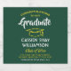 Add a personalized touch to college or high school graduation party decorations with these elegant green, white, and gold yellow beer bottle labels. Design features a green background, yellow mortar board cap, stylish modern typography, handwritten style script calligraphy, and a customizable message reading "Congratulations to our Graduate". Text at the bottom includes class year, school name, and optional lines for degree, beverage type, or other info. All text is simple to customize. These labels make a stylish graduation party drink idea and an elegant addition to the graduate's special day celebration. Cheers!