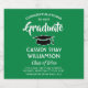 Add a personalized touch to college or high school graduation party decorations with these green and white beer bottle labels. Design features a green background, black mortar board cap, stylish modern typography, handwritten style script calligraphy, and a customizable message reading "Congratulations to our Graduate". Text at the bottom includes class year, school name, and optional lines for degree, beverage type, or other info. All text is simple to customize. These labels make a stylish graduation party drink idea and an elegant addition to the graduate's special day celebration. Cheers!
