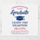 Add a personalized touch to college or high school graduation party decorations with these red, white and blue beer bottle labels. Design features a white background, blue mortar board cap, stylish modern typography, handwritten style script calligraphy, and a customizable message reading "Congratulations to our Graduate". Text at the bottom includes class year, school name, and optional lines for degree, beverage type, or other info. All text is simple to customize. These labels make a stylish graduation party drink idea and an elegant addition to the graduate's special day celebration. Cheers!
