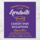 Add a personalized touch to college or high school graduation party decorations with these elegant purple, white and gold yellow wine bottle labels. Design features a purple background, yellow mortar board cap, stylish modern typography, handwritten style script calligraphy, and a customizable message reading "Congratulations to our Graduate". Text at the bottom includes class year, school name, and optional lines for degree, beverage type, or other info. All text is simple to customize. These labels make a stylish graduation party drink idea and an elegant addition to the graduate's special day celebration. Cheers!