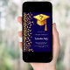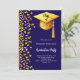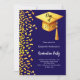 A modern, elegant Graduation party invitation. A dark blue background decorated with faux gold confetti and a large golden graduation cap with tassel. Personalize and add a name and party details. White text.