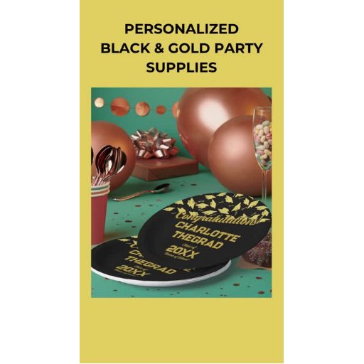 Black and gold school colours, gold graduation caps thrown in the air for both him and her. Nice graduation party gift wrap for a grad party, for a graduate from a high school, college, or university with school colours of Black and gold.