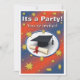 Invitation to a graduation party, with picture of cap and diploma on textured background, of blue and red/orange with yellow starbursts.