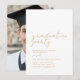 Wish your graduate good luck with this simple and elegant graduation invite. The invitation features an elegant design, with a soft, white background. In the centre, the party details are beautifully script font in a gold text exuding an air of sophistication. The back side has room for a photo. Invite guests to your graduation party with this simple design. Background colour and text is editable.