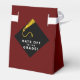 Graduation party favour gifts featuring congrats and classic black graduation cap with gold tassel on maroon background.