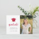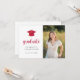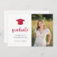 This graduation invitation features a simple black-and-white theme with a red cap and gold tassel. Add a photo and customize text on the front and back to include all details for your graduation party.