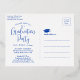 Announce a high school or college graduation and invite family and friends to the party with custom 3 photo collage royal blue, white and gold foil invitation postcards. All pictures and wording are simple to personalize and the colours are easy to change with the Zazzle design tool. This template is set up as a combination announcement card and party invitation that can be customized with any details of your choice, such as parents' names, special honours, degree title, favourite inspirational quote, graduate's future plans or new address. The royal blue, white and gold design features a mortar board cap, modern trendy script calligraphy, elegant minimalist typography, and three favourite photos, such as senior pictures or images from the commencement ceremony. This graduation postcard is a stylish way to announce a special day celebration. Congratulations to the graduate!