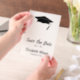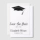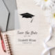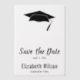 ''Save the Date' for a graduation party with this black and white save the date. You can personalize it with the graduate's name and party date. A graduate's cap is at the top above the text.
