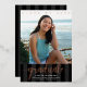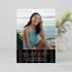 Be proud, rejoice and announce to the world that your favourite grad has reached their milestone with this stunning, simple, modern, personalized announcement invite. Sparkly, elegant, real rose gold foil calligraphy script, white sans serif typography and a photo of your choice overlay a black and dark grey striped background. Personalize the custom text with your graduate’s name, school name, class year, and graduation date. On the back, add your personal note, next school they’re attending, party information, etc. Matching and coordinating thank you cards, cap toppers, fans, napkins, plates, banners and other graduation goodies are also available in this trendy and stylish collection. Guaranteed to add stylish fun to their special occasion!